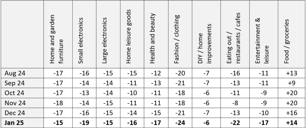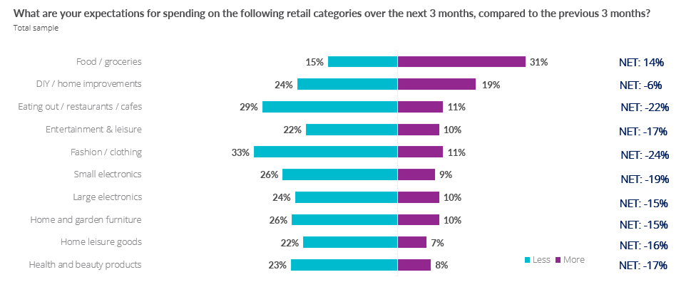 Within the categories, consumer expectations over the same period for spending on home and garden furniture are down 15%, while DIY and home improvements were also down by 6%.